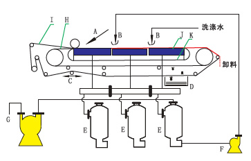 技术特点◆环型橡胶排液带,采用硫化成型既带体与沟槽一次压模成型的制造工艺,抗拉强度大, 使用寿命长。 ◆真空盒和胶带间设有环型磨擦带,并以水进行密封和润滑,可维持较高的真空度,并有利于减少橡 胶带的磨擦。 ◆真空排液采用自由落差式(高位排液)、自动排液式(零位排液),以满足各种工况条件的要求。 ◆整体结构采用了模块化设计,可灵活组装,具便于运输和安装。 ◆控制系统应用了DCS技术、可实现现场和远程自动控制。 工艺流程图A、加料装置 B、淋洗装置 C、纠偏装置 D、清洗装置 E、气液分离器 F、返水泵 G、真空泵 H、橡胶带 I、滤布 J、真空盒 K、磨擦带